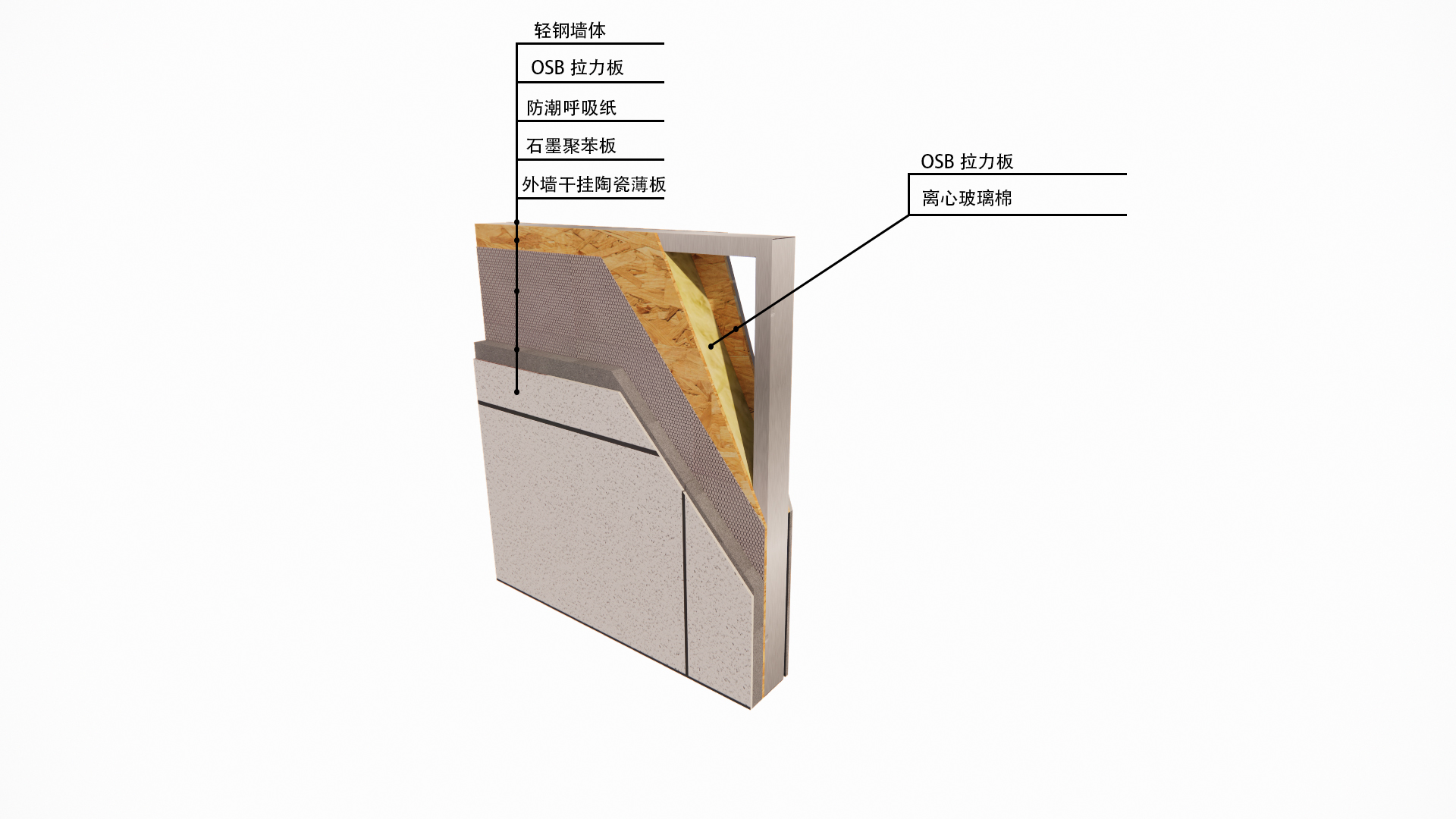 两板:是指在轻钢龙骨的两侧分别安装的结构板。一般来说,内墙常使用水泥纤维挂板或石膏板等;外墙也使用水泥纤维板等材料。这些结构板起到围护和初步的结构支撑作用。